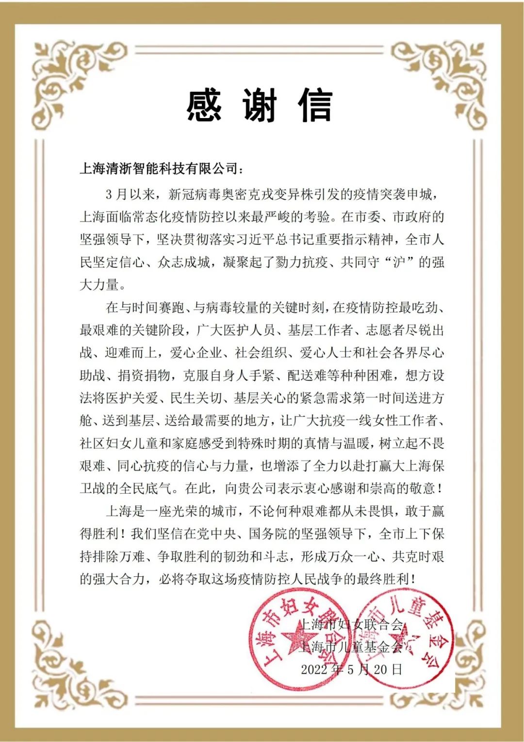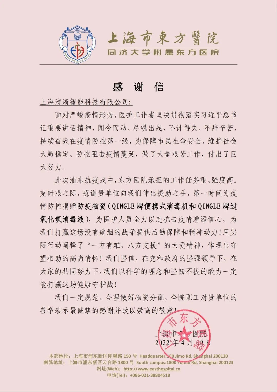 近期,苏州清乐智能科技有限公司子公司—上海清淅智能科技有限公司收到了来自上海市东方医院和上海市妇女联合会、上海市儿童基金会的感谢信。感谢我司及时伸出了援助之手,第一时间为疫情防控捐赠防疫物资(QINGLE牌消毒机和QINGLE牌消毒液),为医护人员全力以赴抗击疫情增添信心,也让广大抗议一线女性工作者、社区妇女儿童和家庭感受到特殊时期得真情与温暖。