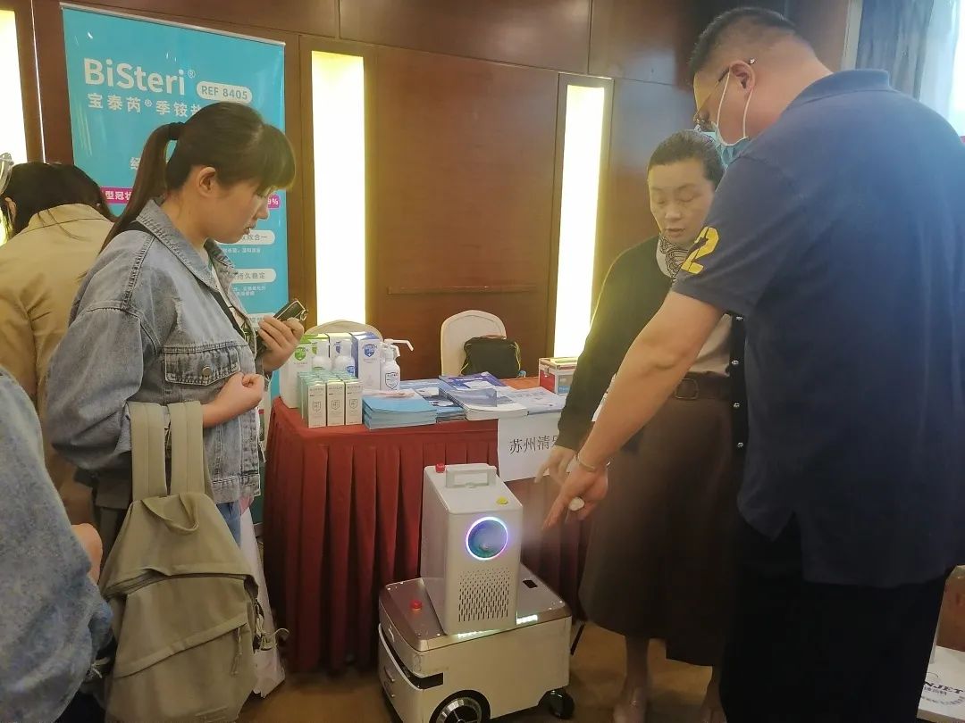为推进江苏省医院信息化建设与发展,江苏省医院感染管理专业委员会2021年学术年于2021年4月28-30日在南京国际会议中心成功举办。本次会议邀请了来自省内部分二、三级医院分管院领导,医院感染管理科、护理部等部门负责人及相关人员860余人参加会议。为了活跃学术气氛,促进医、工、贸结合,会议期间举办了与会议内容相关的医疗器械和药品的展示活动,并与参会的专家和代表进行深入交流。苏州清乐公司精彩亮相会议现场并为大家展示了高安全性、可自适应调节消毒模式、智能的专业消毒机。苏州清乐为大家提供了零距离接触消毒机的机会,感受消毒机全自动运行、干雾消杀等一系列智能化过程。同时,针对不同医疗应用场景的消毒解决方案也吸引了众多参会代表驻足停留。目前,医院依然多采用人工消毒的方式,这种消毒方式存在的隐患是:一,消毒不均匀,空间死角可能无法彻底消毒;二,如果是高风险区域,工作人员还有感染的风险。为此,苏州清乐与上海交通大学达成产学研合作,经过多年努力共同研发了高智能的专业消毒机,与人工消毒相比,它不仅工作效率更高,更重要的是,可以确保消毒的彻底性和人员的人身安全。该款消毒机器人将过氧化氢设备与机器人相结合,在机器人内部装置消毒系统产生消毒气体,在无人环境下能够实现自主导航、自主移动,高效、精准地对室内进行360°无死角消毒防疫,还可以模拟人类自由移动的能力,代替人深入疫情严重区域,减少因为“消毒”而造成消毒人员感染传播的可能。